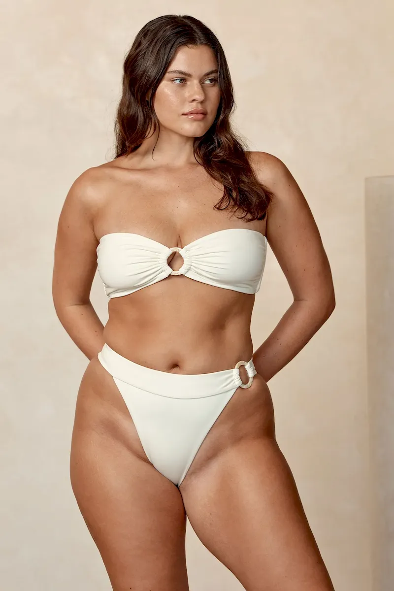 Complementing every shape. the Antigua Bottom is the perfect way to accentuate your waist. The high cut leg shape elongates your figure and gives a cheekier back coverage. Finished with a chic pearl ring detail.