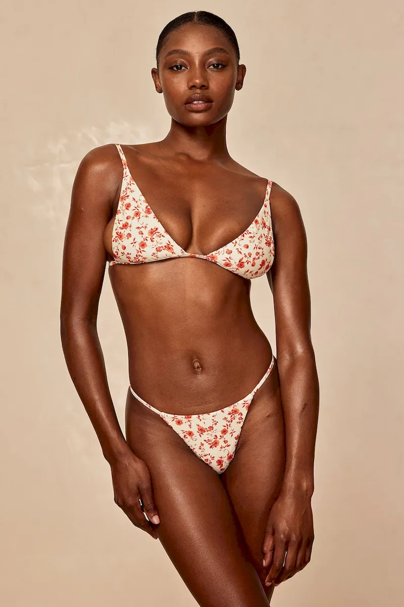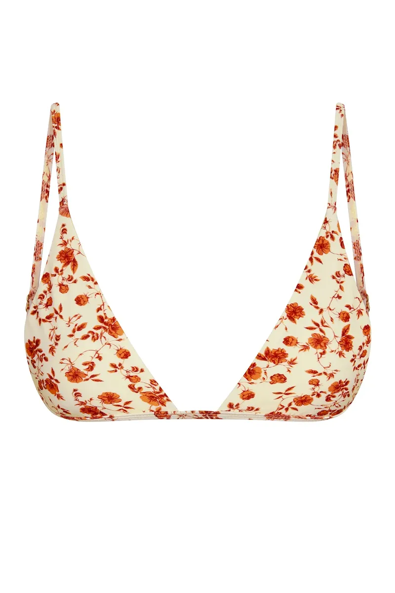 The Barbados Top is made for the perfect fit. This effortless modern top features fixed tall triangle cups with thin over the shoulder straps. delicate gold adjustable sliders and a back tie closure.