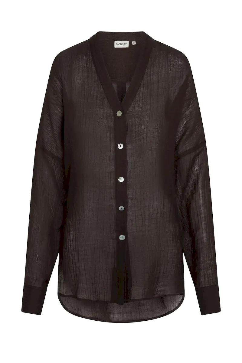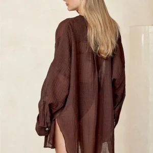 The ultimate beach to bar look can be achieved in the Barcelona Tunic. With an airy oversized fit. this transitional piece can be worn open. over your favorite swimwear or tied at the front with cute pants. Complete with side slits. flowy sleeves and center front seashell buttons.