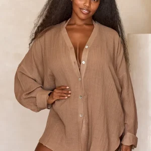 The ultimate beach to bar look can be achieved in the Barcelona Tunic. With an airy oversized fit. this transitional piece can be worn open. over your favorite swimwear or tied at the front with cute pants. Complete with side slits. flowy sleeves and center front seashell buttons.