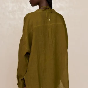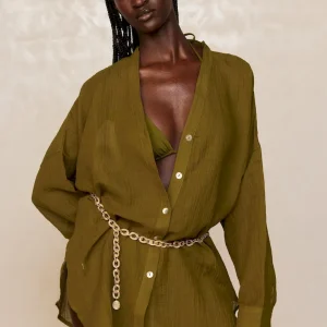 The ultimate beach to bar look can be achieved in the Barcelona Tunic. With an airy oversized fit. this transitional piece can be worn open. over your favorite swimwear or tied at the front with cute pants. Complete with side slits. flowy sleeves and center front seashell buttons.