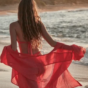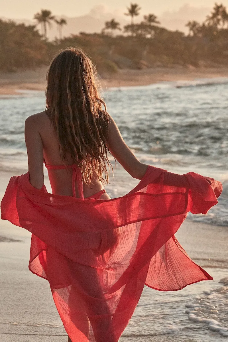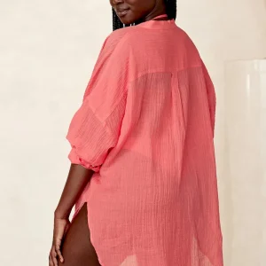 The ultimate beach to bar look can be achieved in the Barcelona Tunic. With an airy oversized fit. this transitional piece can be worn open. over your favorite swimwear or tied at the front with cute pants. Complete with side slits. flowy sleeves and center front seashell buttons.