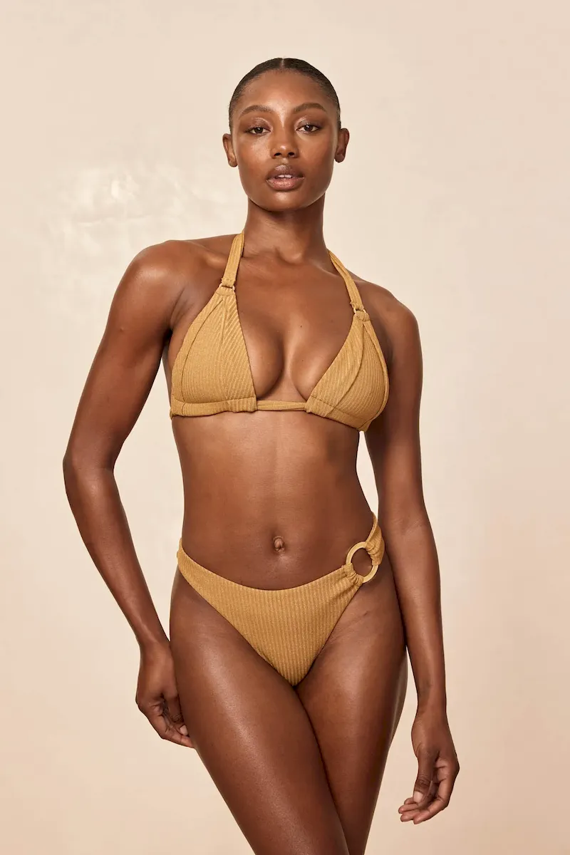 Meet the Bronte Bottom. a playful and stylish swimwear essential designed to make a statement. Finished with a chic gold ring detail at the side. this cheeky swim bottom adds a touch of luxury to your look. ensuring you stand out with confidence.