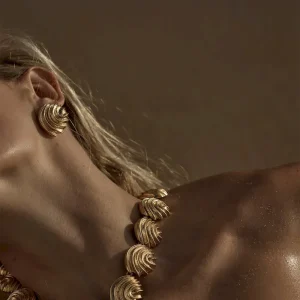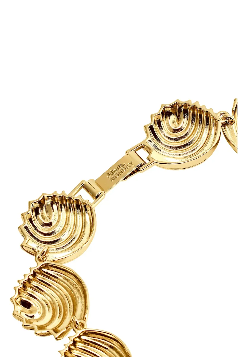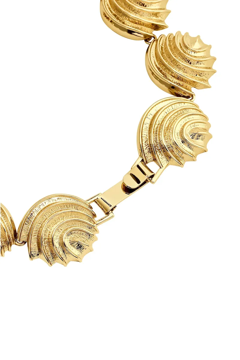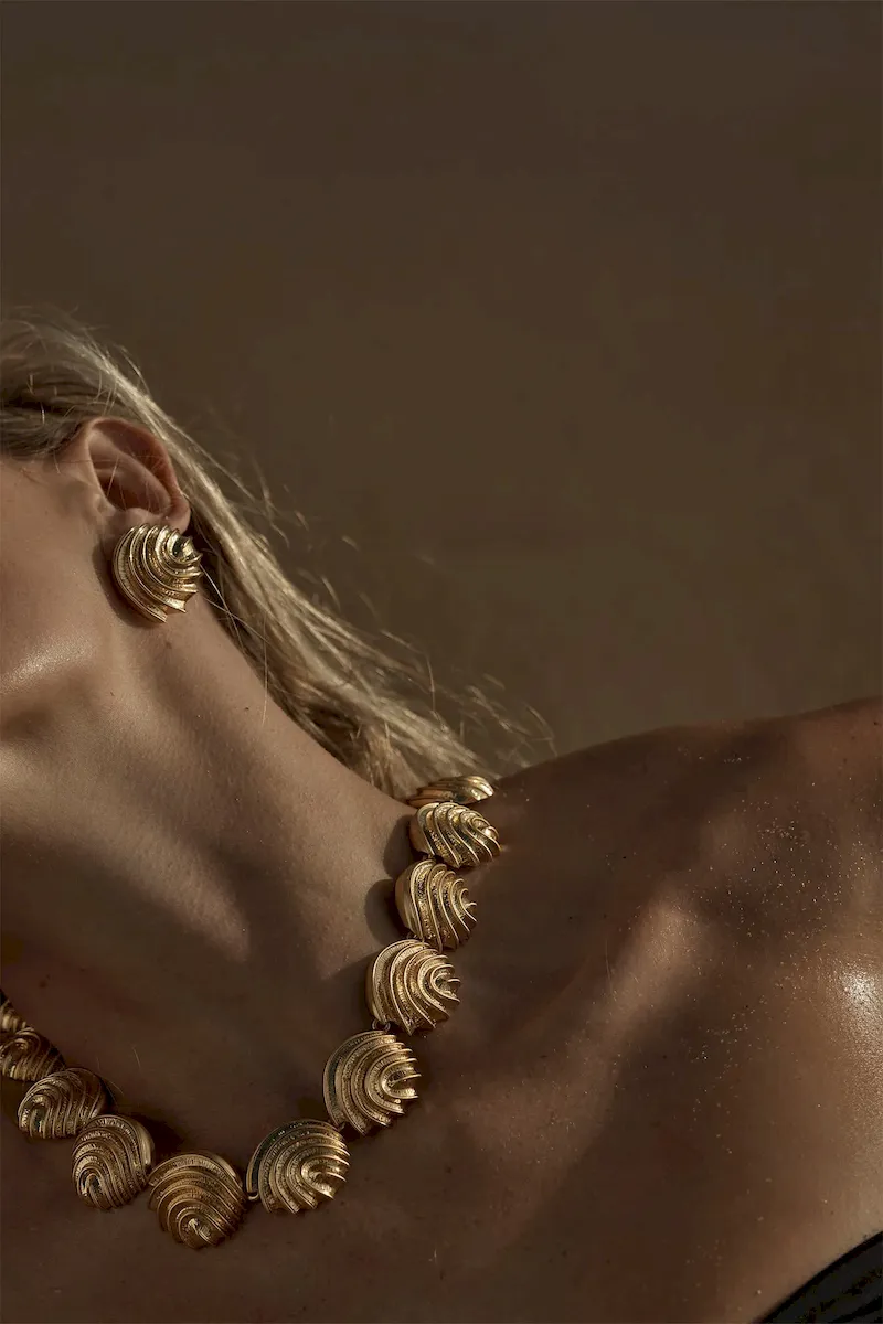 The Cayman Necklace is a refined embodiment of coastal sophistication. Crafted from 18K gold-plated brass. its sculptural shell design captures the essence of seaside elegance. Measuring 17 inches in length. it rests gracefully at the collarbone. while a sleek hook clasp ensures effortless wear. Perfect for elevating any ensemble. this timeless piece transitions seamlessly from day to night. making it a true statement of understated luxury.