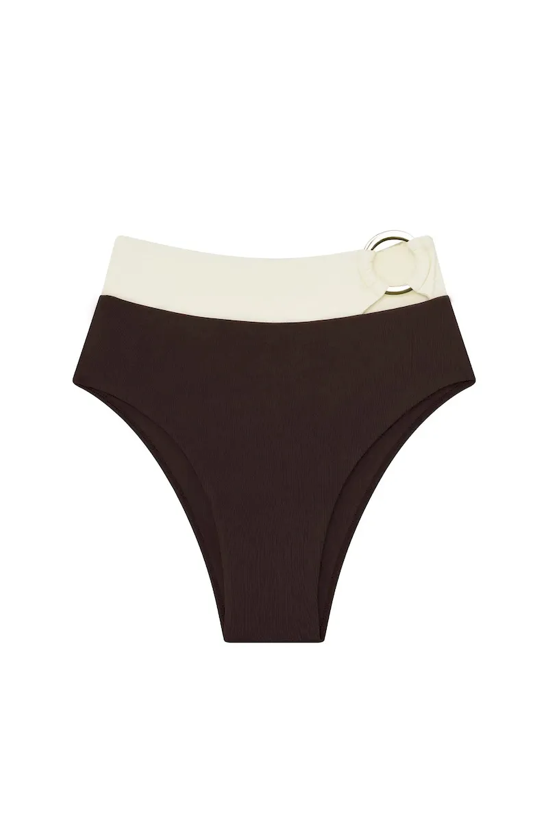 The Costa Rica Bottom offers the perfect balance of classic lines and thoughtful details. With full coverage and a high-waisted fit. it smooths and flatters in all the right places. A statement gold ring detail at the front adds just the right amount of shine.