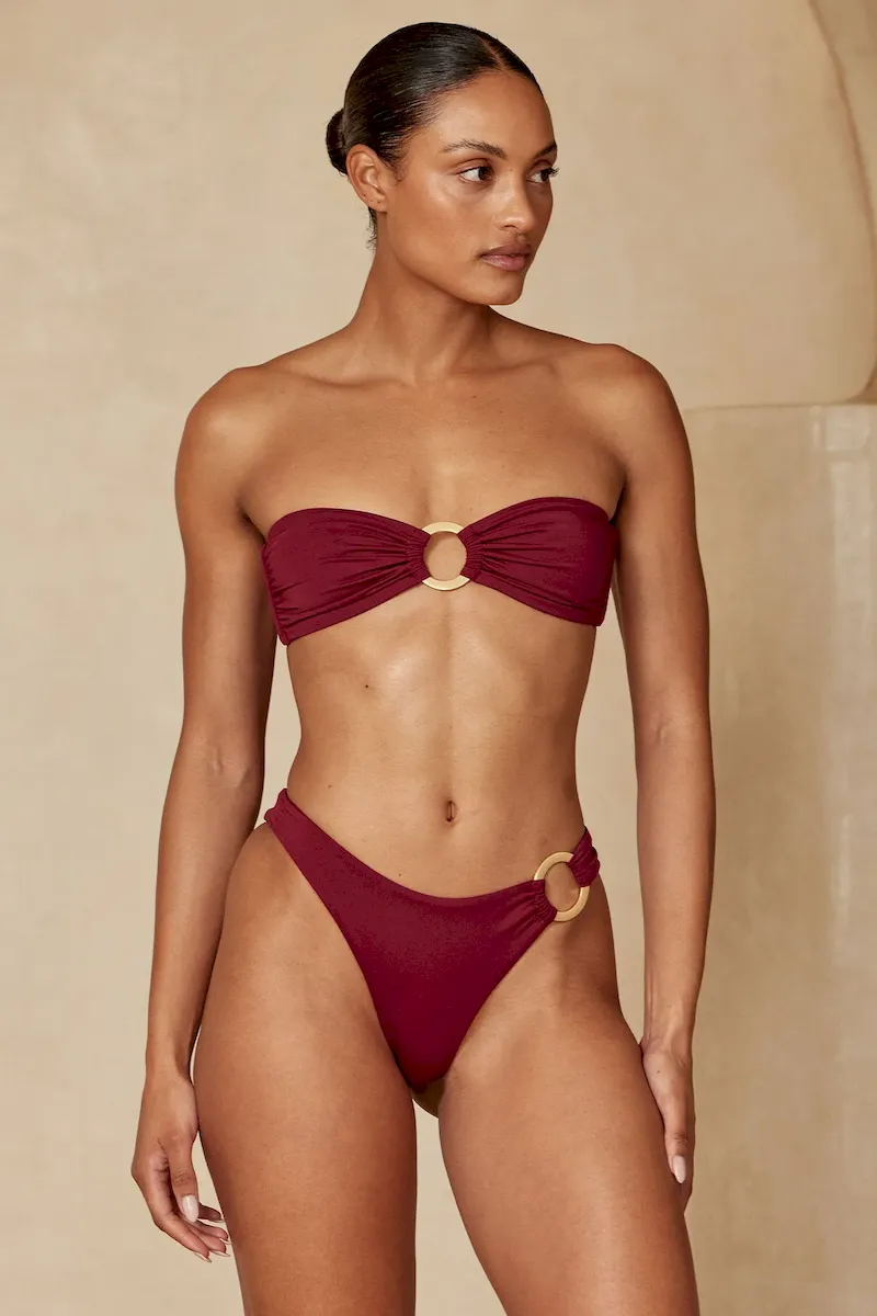 Soak in the sun while wearing the Costa Rica Top. This bandeau style top features a center front matte gold ring hardware and a removable halter strap that can be adjusted for the perfect amount of lift and support for all your beach adventures. Perfect for cup sizes A-D!