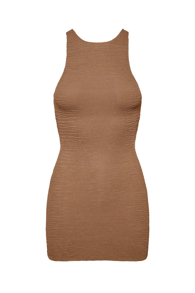 The Kokomo Dress is the perfect dress we all need on rotation this summer. Designed in our recycled crinkle swim fabric. this high neck mini dress has the added support of a built in shelf bra. Pair the Monaco Shirt over for an effortless layered look that can easily be dressed up or down.