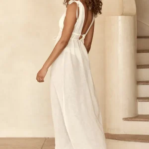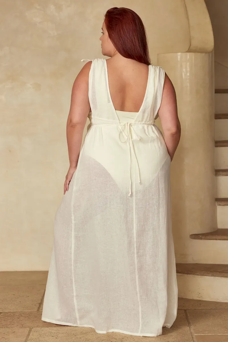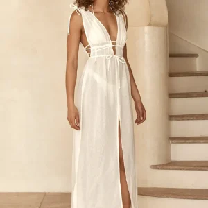 Find your inner goddess in the Mallorca Dress. Offering a chic and elevated look. this maxi dress features cut out details. high slit details. a plunging neckline and wrap around tie detailing. perfect for a custom fit. Pair with any accessory for a beach-to-bar look.