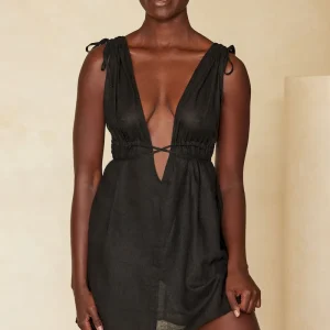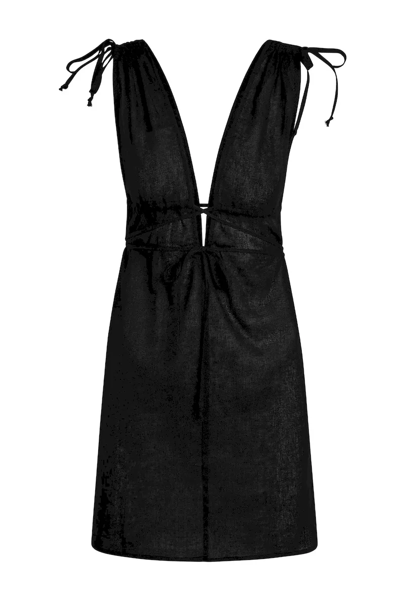 Bare a little skin in the Mallorca Mini Dress. Offering a chic and elevated look. this linen mini dress features cut out details. a plunging neckline and wrap around tie detailing. perfect for a custom fit.