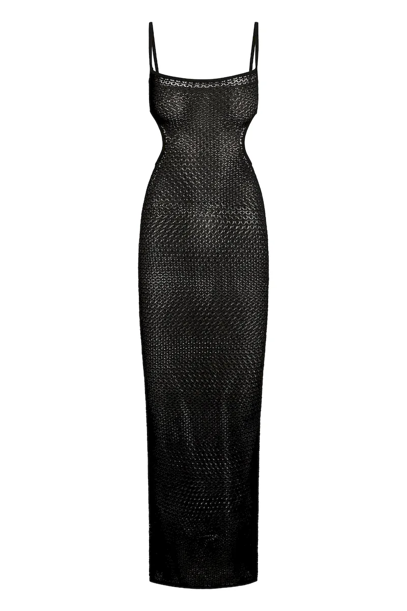 Unveil effortless elegance with the Marrakesh Dress. where bold design meets timeless allure. Featuring an open cut-out waist and adjustable back straps. a floor-grazing maxi dress and semi-sheer silhouette perfect for sultry escapes.
