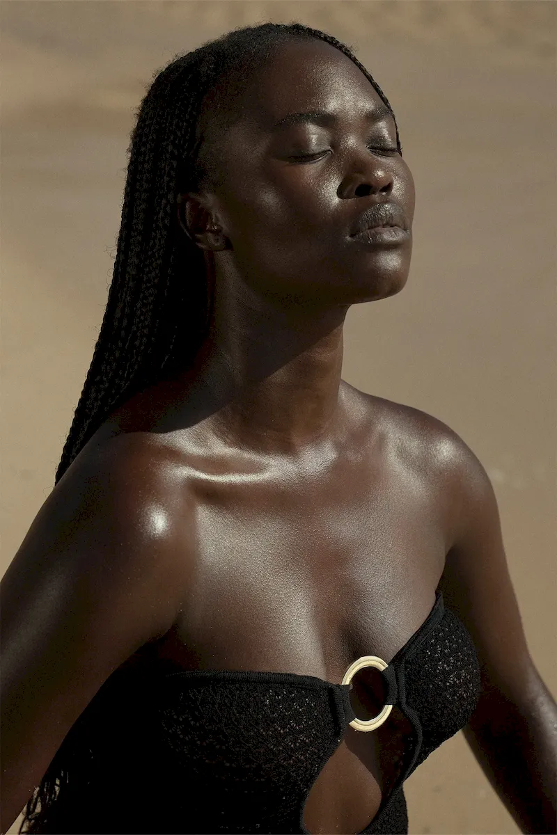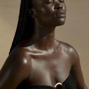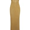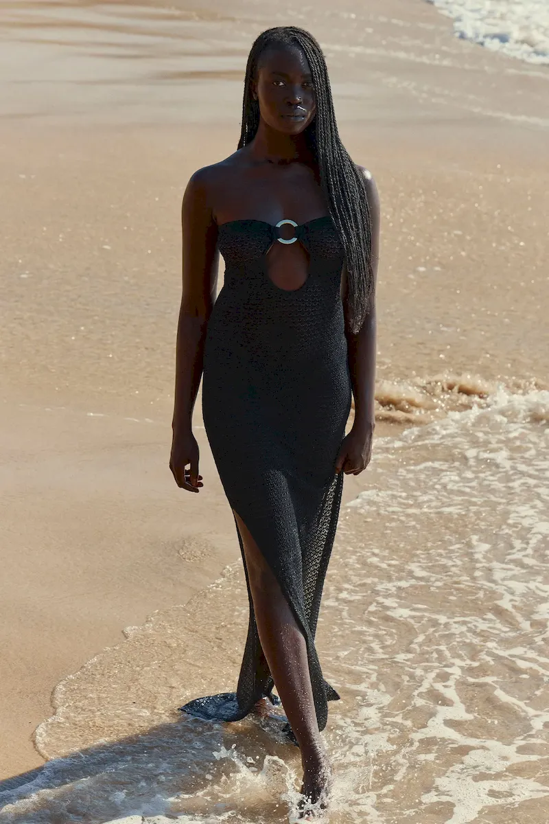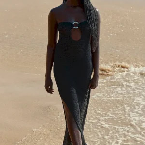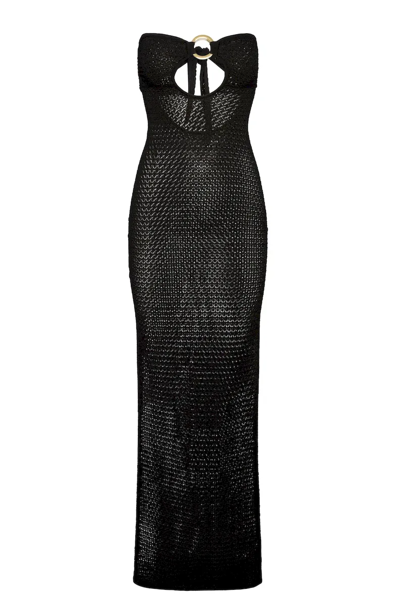 Turn heads in the Montego Bandeau Dress. featuring a plunging front keyhole for a flawless fit and a gold hardware ring for a touch of luxury. Side seam slits and an ankle-grazing. semi-sheer design tease just the right amount of skin for sunlit days and moonlit nights. Finished with an adjustable back tie. this piece is elegance redefined.