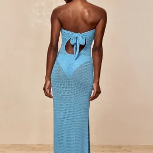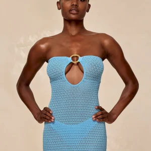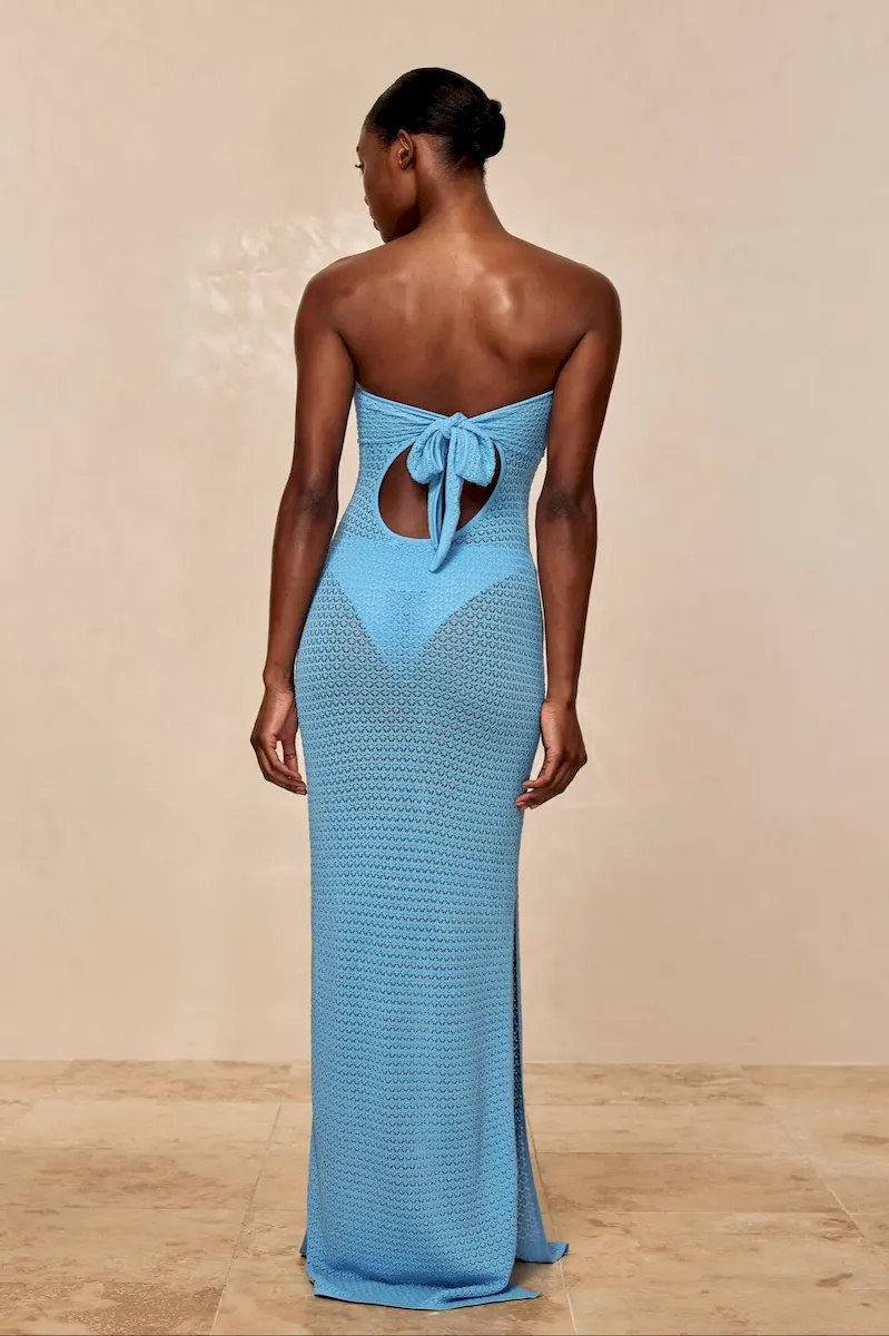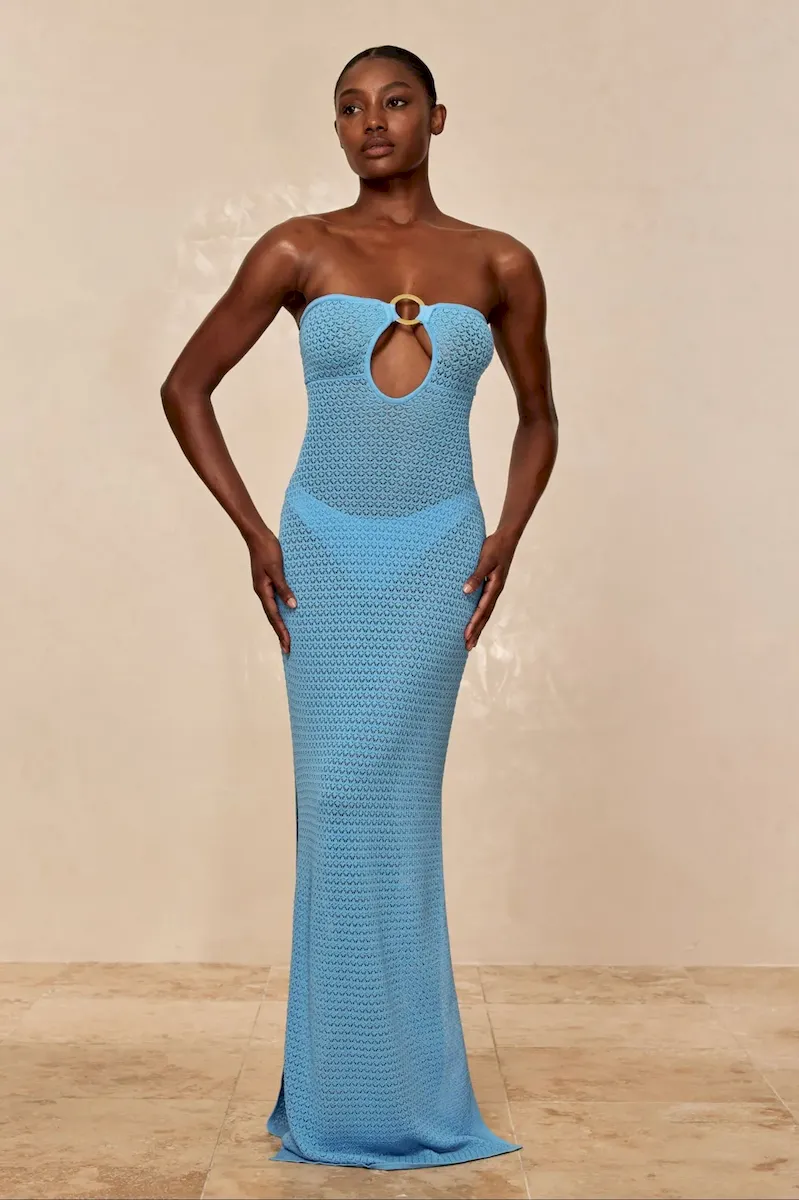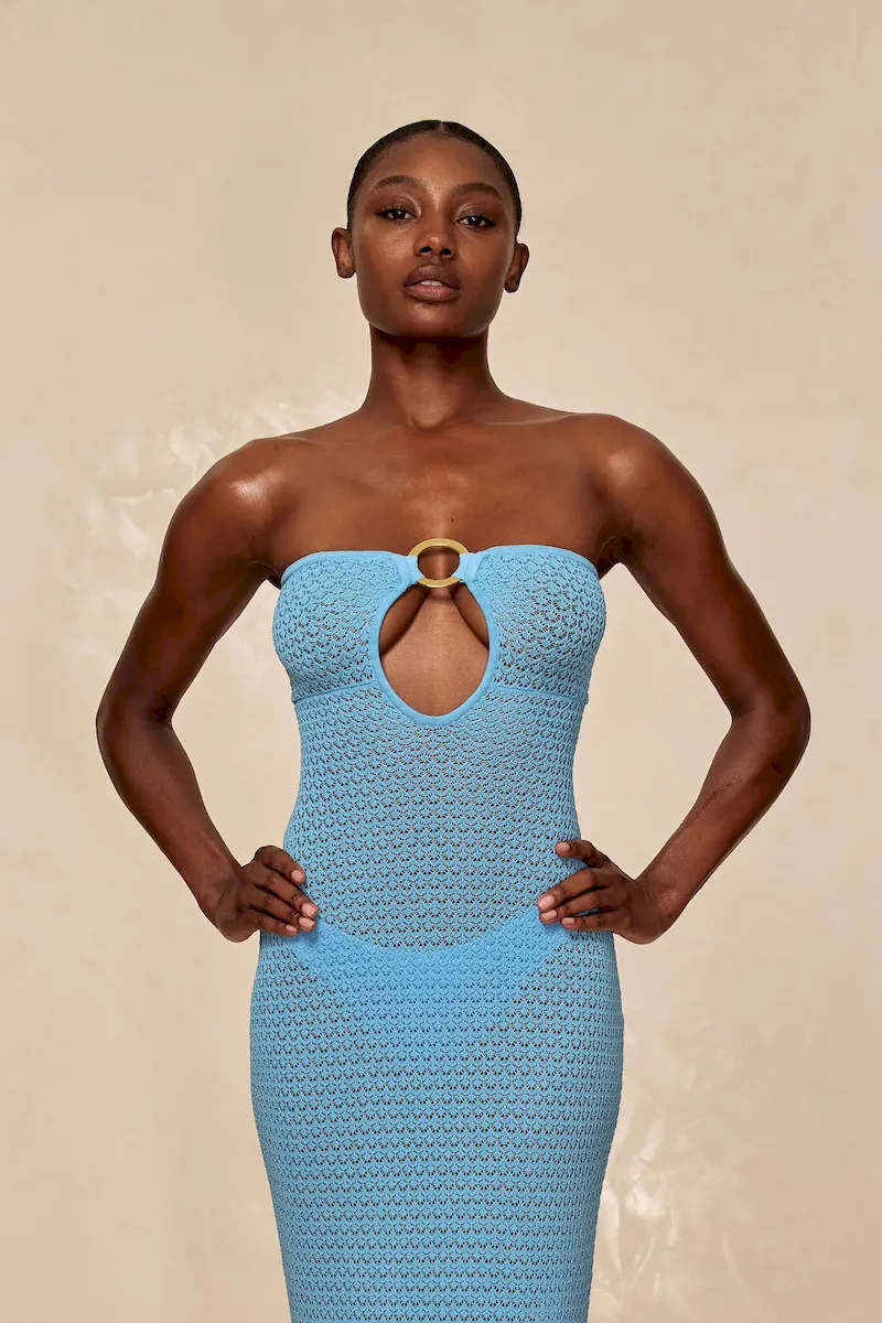 Turn heads in the Montego Bandeau Dress. featuring a plunging front keyhole for a flawless fit and a gold hardware ring for a touch of luxury. Side seam slits and an ankle-grazing. semi-sheer design tease just the right amount of skin for sunlit days and moonlit nights. Finished with an adjustable back tie. this piece is elegance redefined.