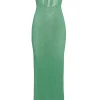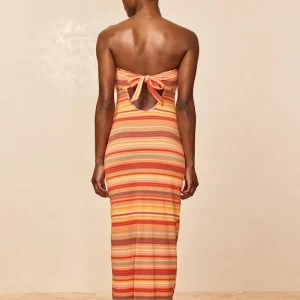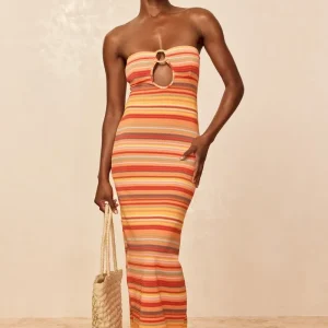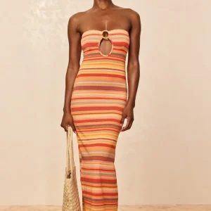 Turn heads in the Montego Bandeau Dress. featuring a plunging front keyhole for a flawless fit and a gold hardware ring for a touch of luxury. Side seam slits and an ankle-grazing. semi-sheer design tease just the right amount of skin for sunlit days and moonlit nights. Finished with an adjustable back tie. this piece is elegance redefined.