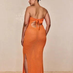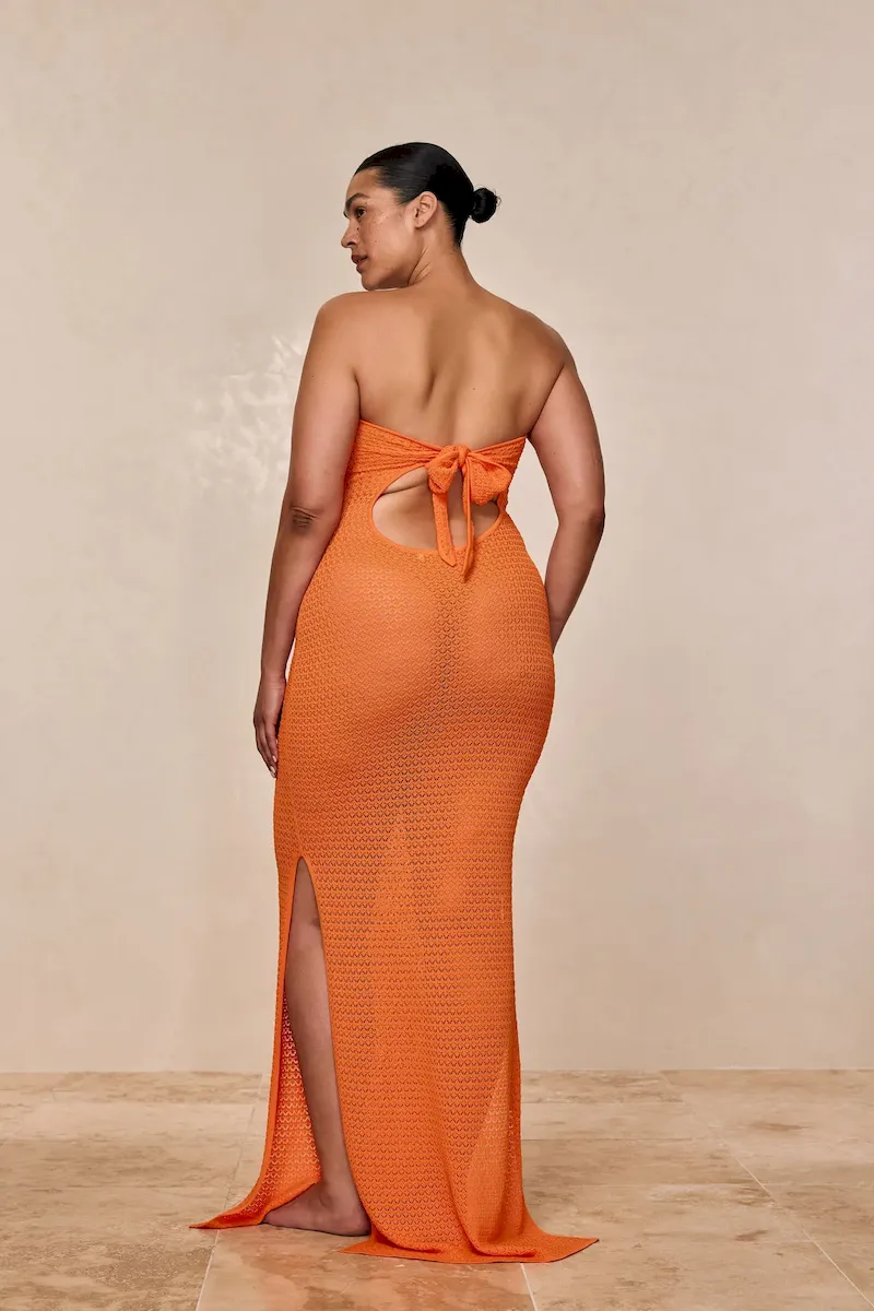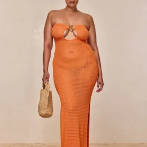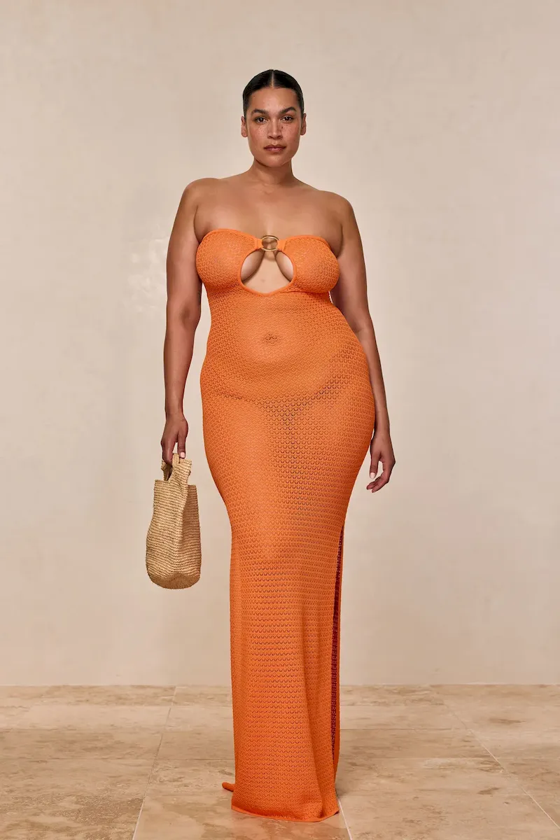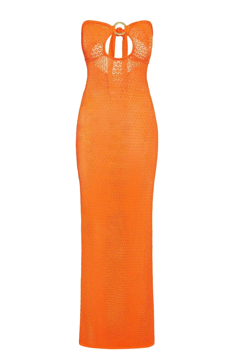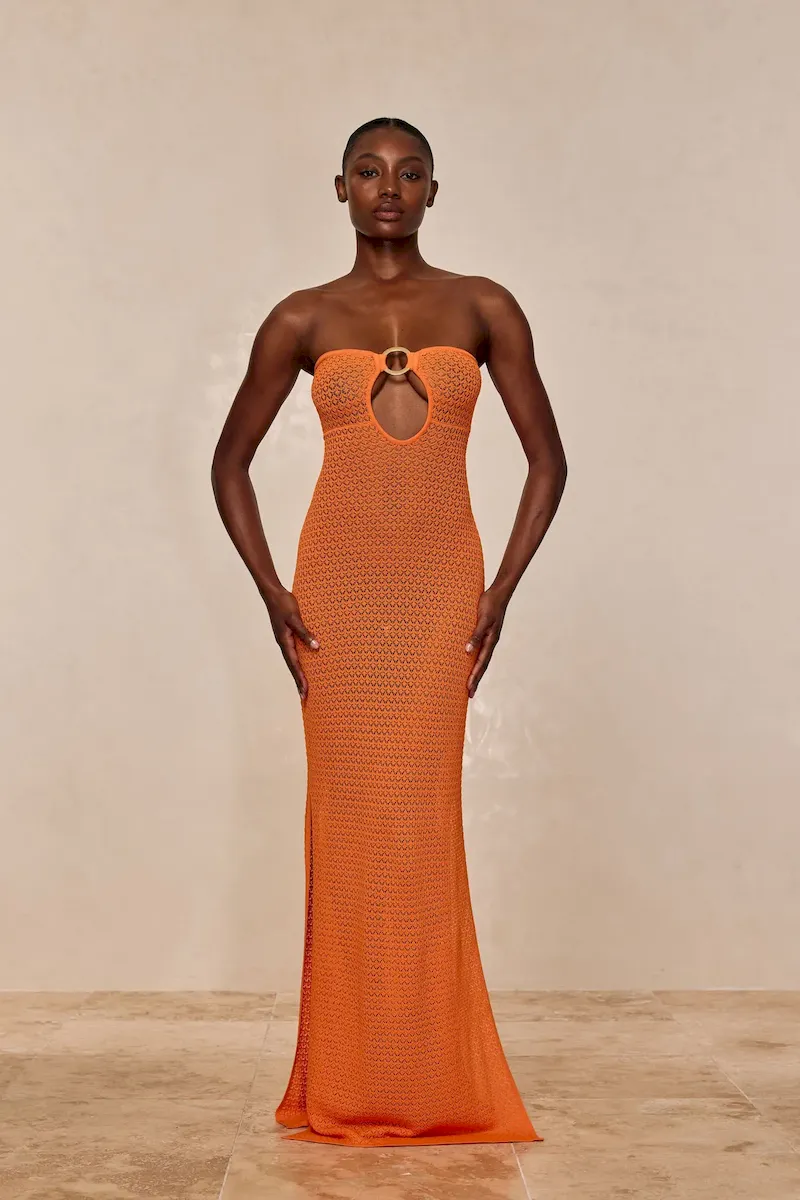 Turn heads in the Montego Bandeau Dress. featuring a plunging front keyhole for a flawless fit and a gold hardware ring for a touch of luxury. Side seam slits and an ankle-grazing. semi-sheer design tease just the right amount of skin for sunlit days and moonlit nights. Finished with an adjustable back tie. this piece is elegance redefined.