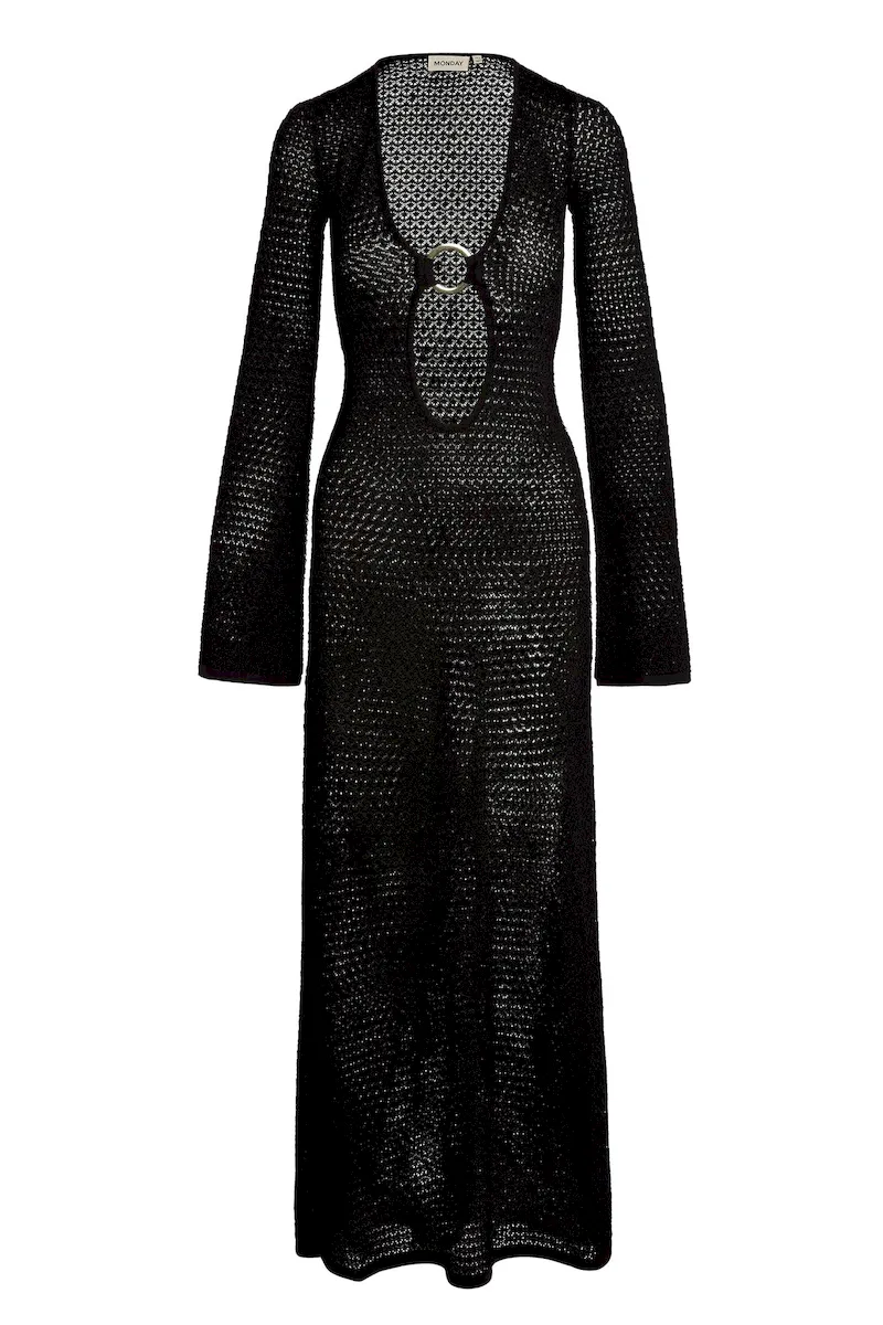 The Montego Dress will make you feel and look your best. Made in a luxe crochet knit. this elegant dress with a plunging neckline. gold ring detailing and high side seam slits will make you brighten up any room you walk in. Paired with any of our swim. this dress will elevate any beach look!