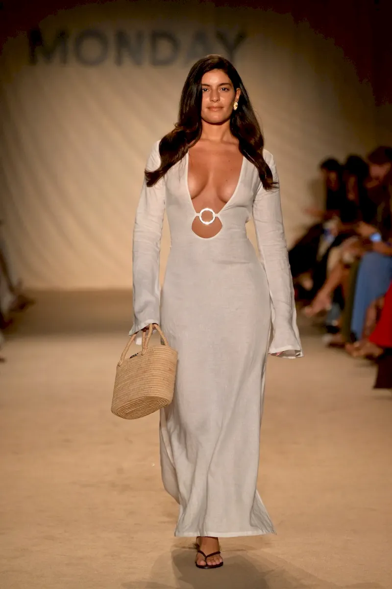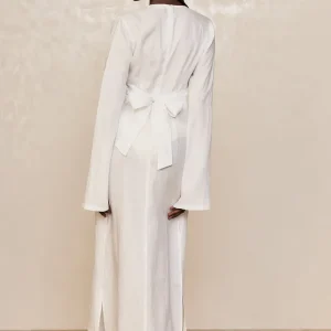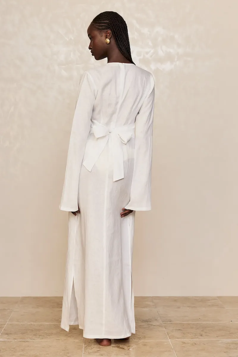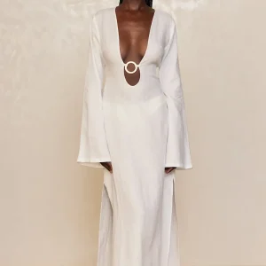 Glamorous and chic! This Montego Dress will make you feel like a star. Made in an airy linen. this elegant dress with a plunging neckline. gold ring detailing and high side seam slits will make you brighten up any room you walk in. Paired with any of our swim. this dress will elevate any beach look!