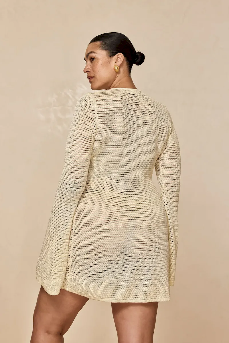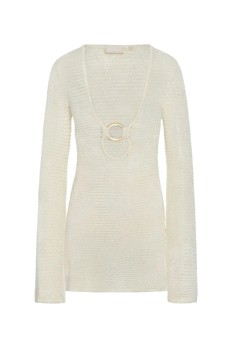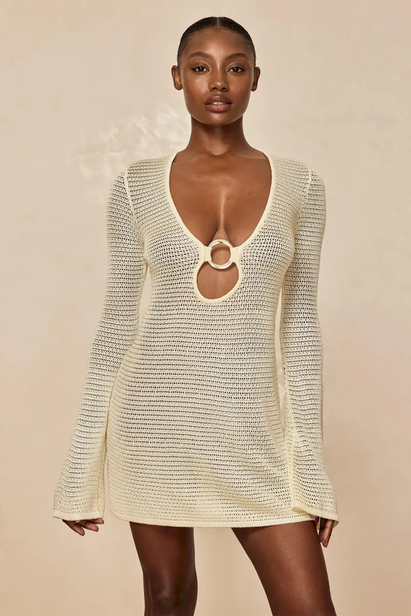 Our best selling dress now comes in a shorter option. This Montego Mini Dress is made in our new treble knit fabric with a plunging neckline. matte gold ring detail and a flattering silhouette that makes it the perfect dress.