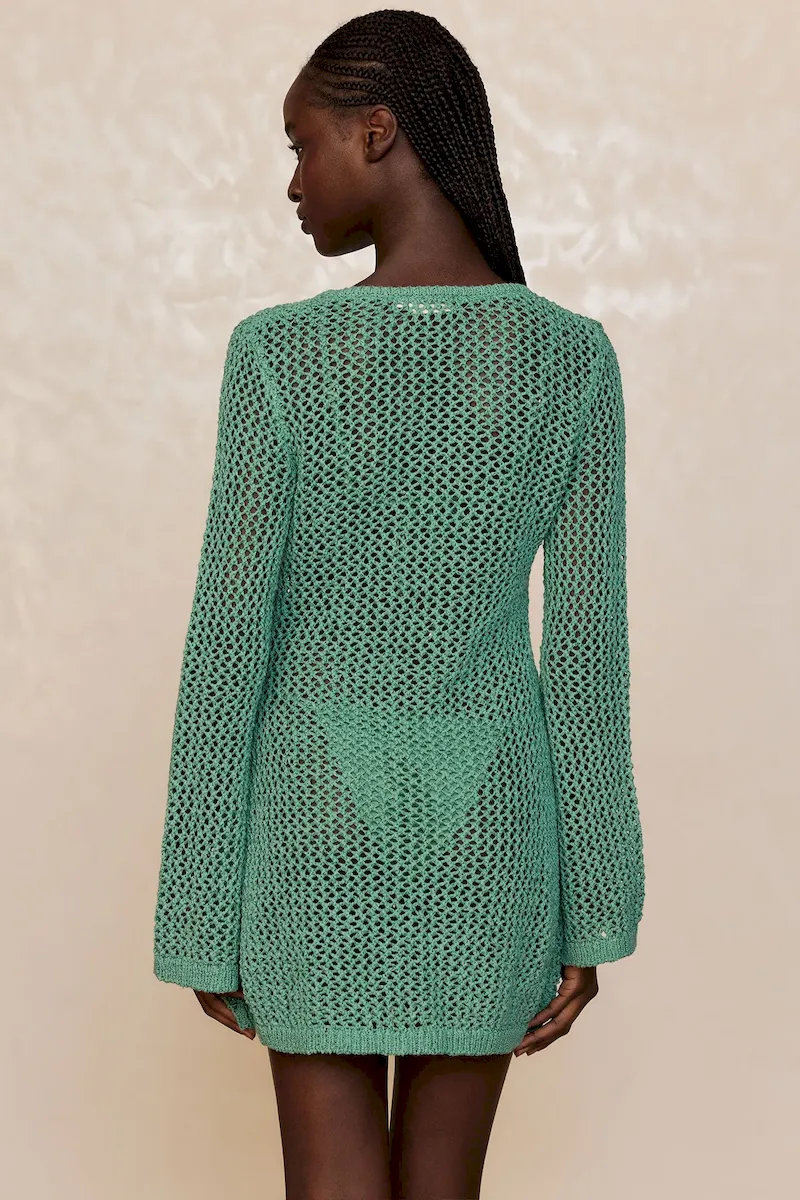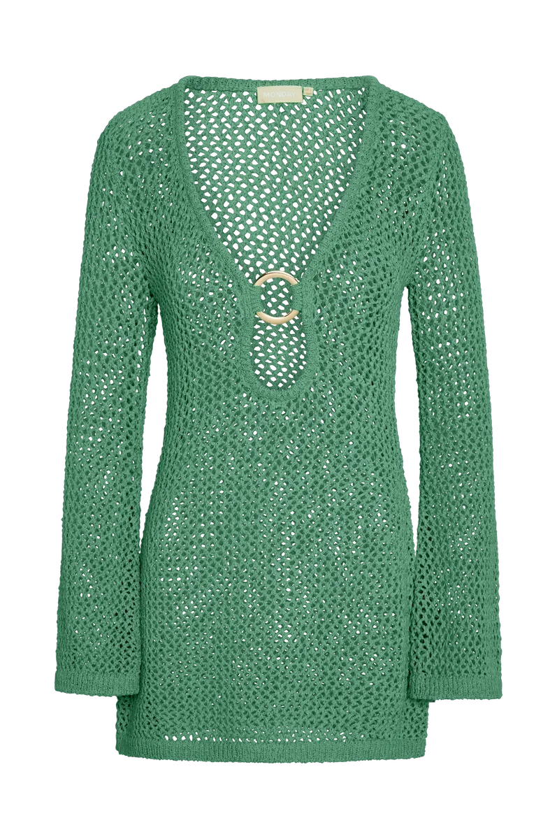 Our best selling dress now comes in a shorter option. This Montego Mini Dress is made in our petit crochet fabric with a plunging neckline. gold ring detail and a flattering silhouette that makes it the perfect dress.