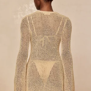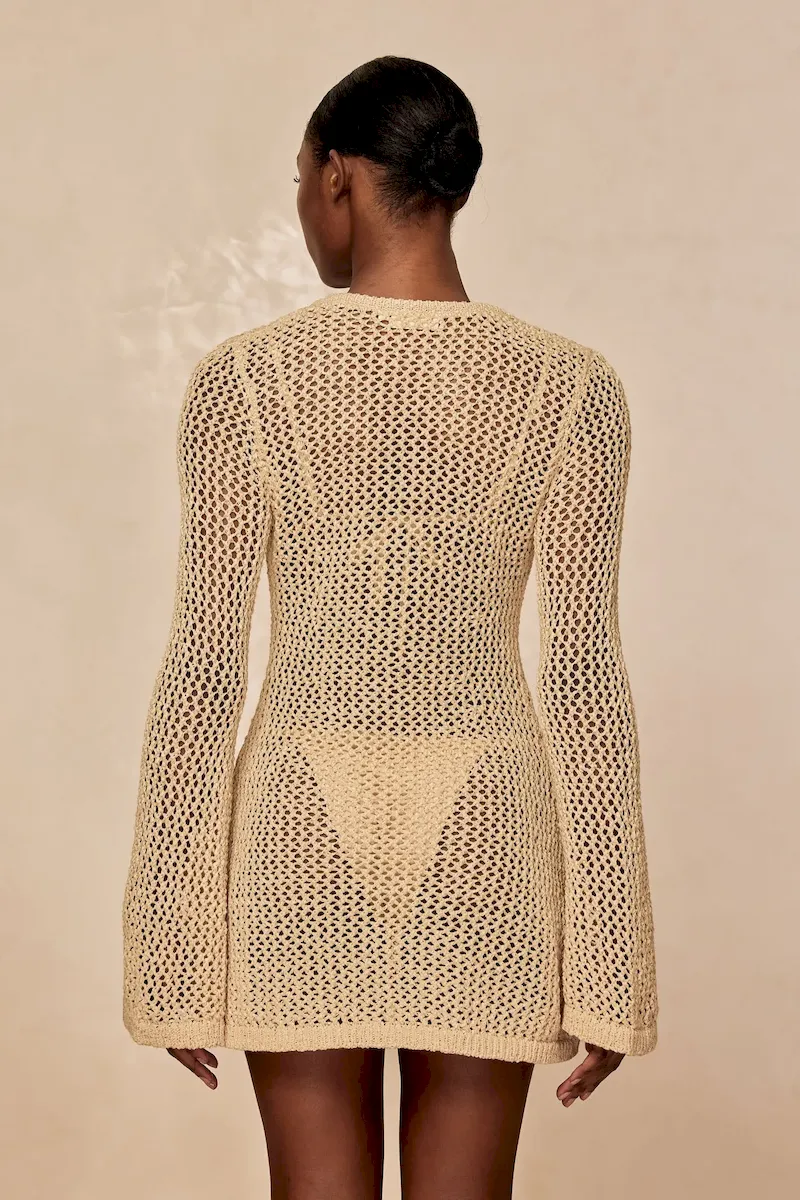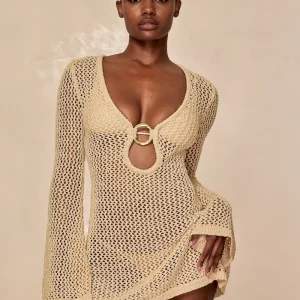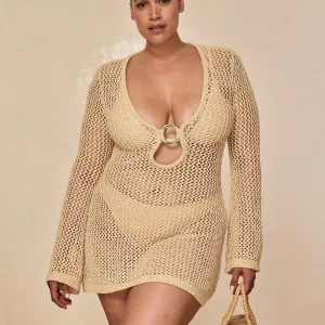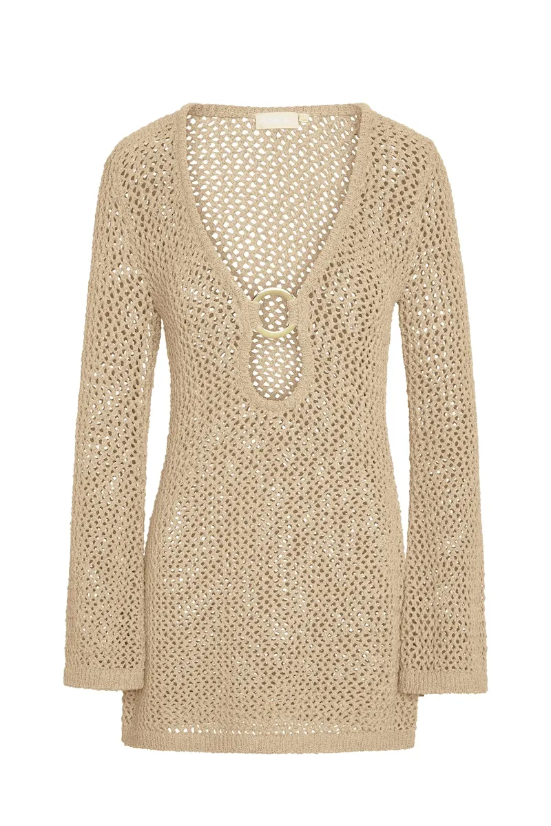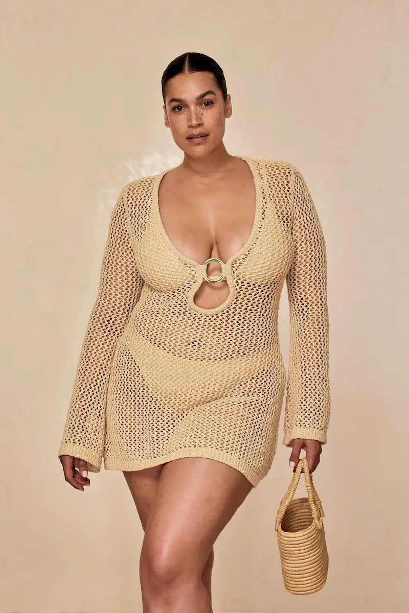 Our best selling dress now comes in a shorter option. This Montego Mini Dress is made in our petit crochet fabric with a plunging neckline. gold ring detail and a flattering silhouette that makes it the perfect dress.