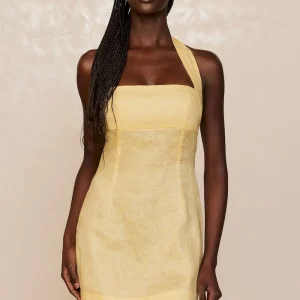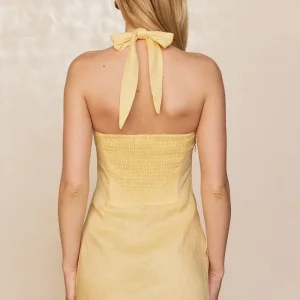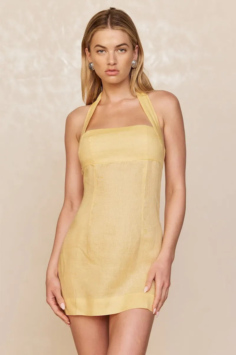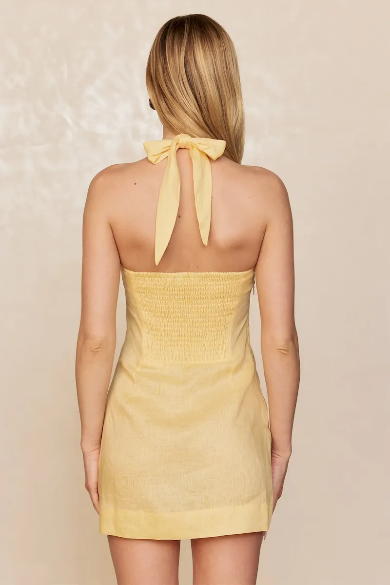 Classic & chic. this linen mini dress is made for warm-weather escapes. It features a chic square neckline and a halter design with adjustable ties for a personalized fit. The smocked back adds comfort and ease. while the invisible side zip keeps the look sleek. Lightweight and effortlessly stylish. the Montserrat Mini Dress is your perfect vacation-ready piece.