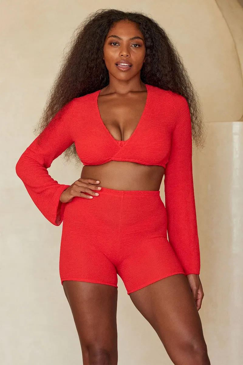 A sporty alternative to your coverup essentials. the Santa Cruz Short. Designed in our recycled crinkle swim fabric. this high waisted short comfortable and flattering. Pair the Azores Top for a completed look.