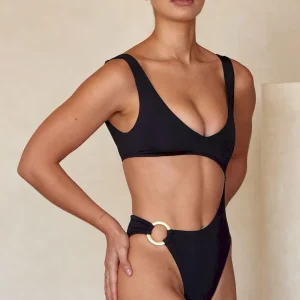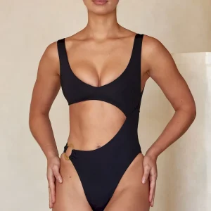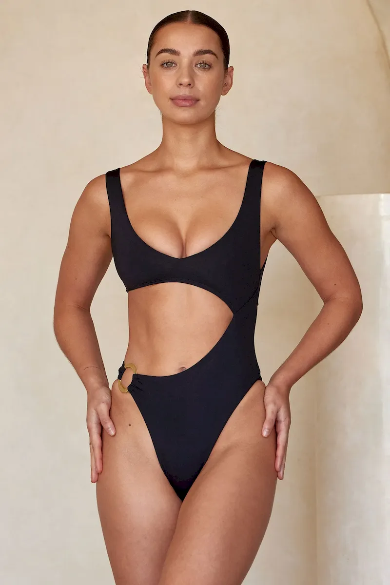 We can’t take our eyes off the St. Barth’s One Piece. From the sultry cut-out detail to the flattering silhouette. this must-have one piece is made to show off your figure. Complete with a rounded v-neckline. adjustable back tie closure and a gold ring detail. All eyes on you!