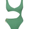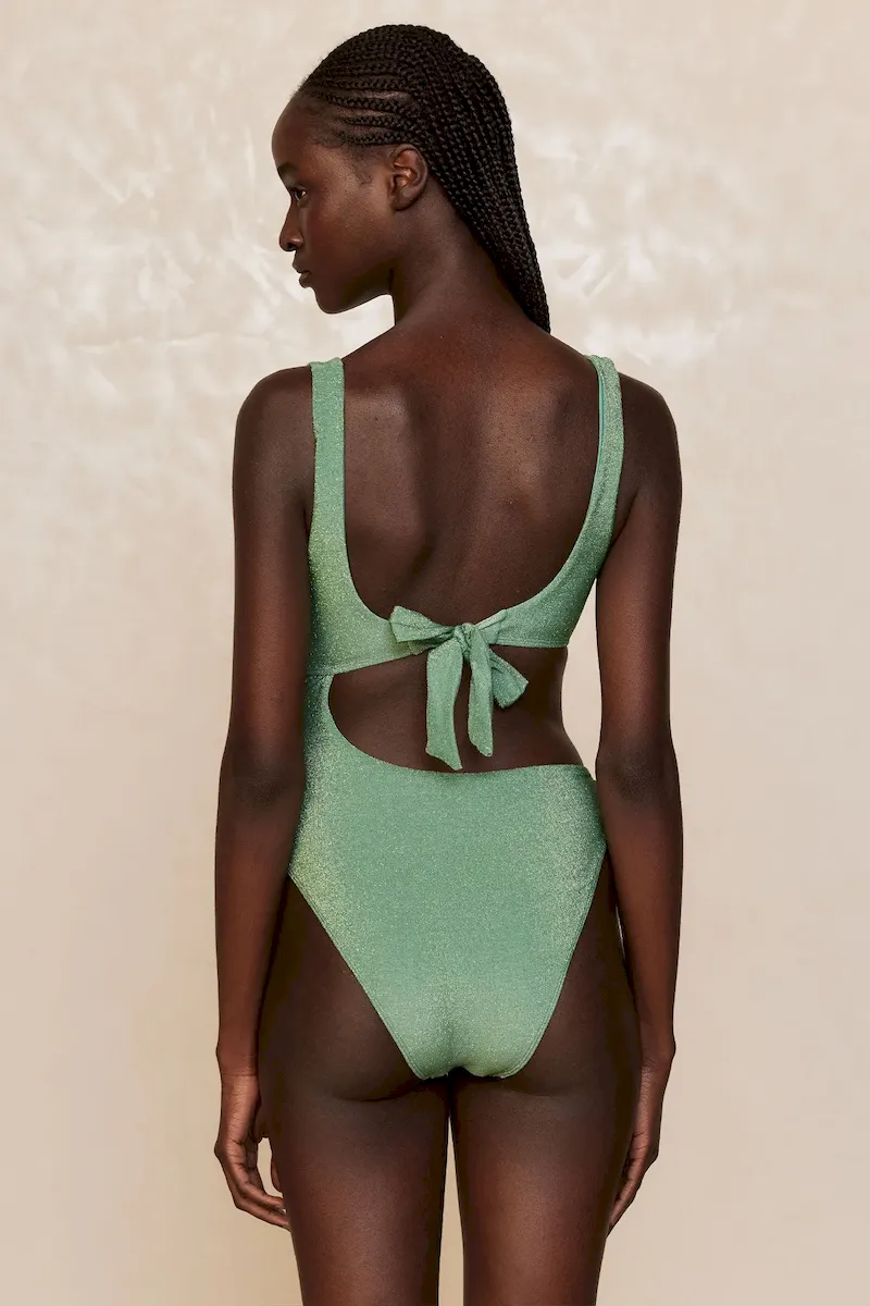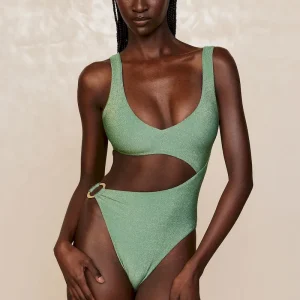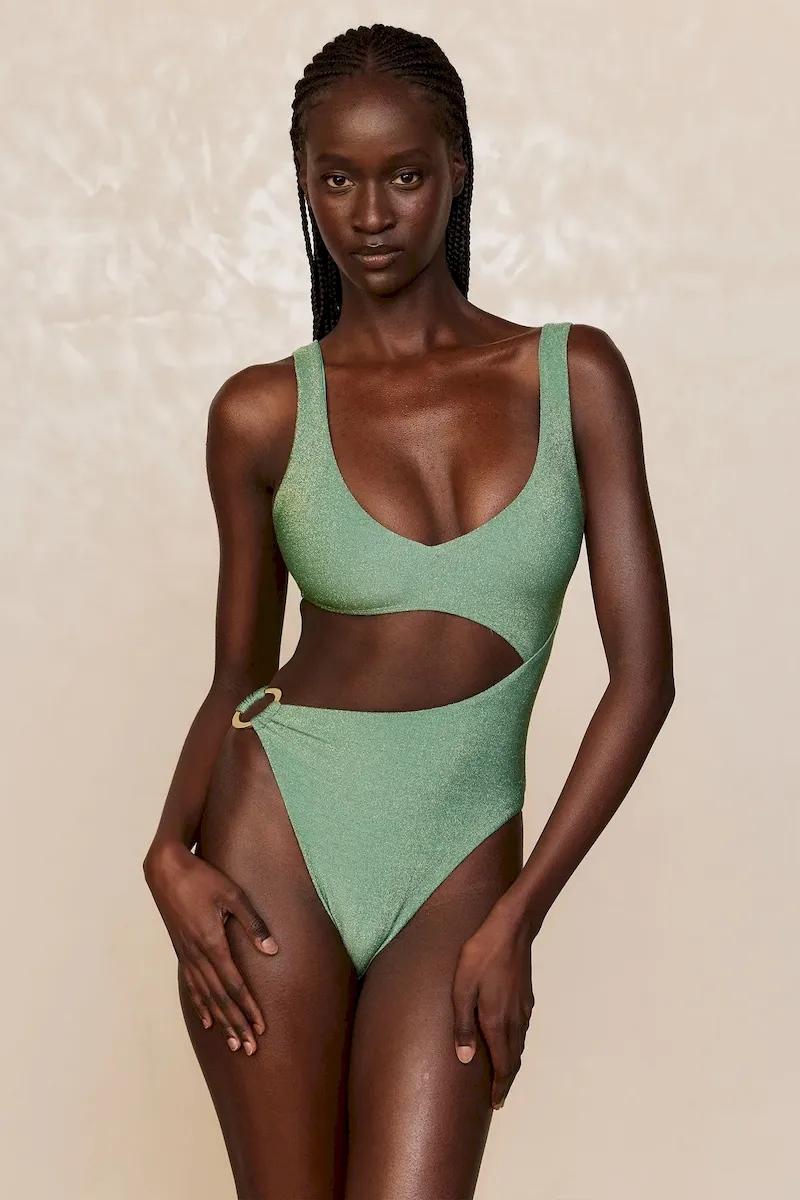 We can’t take our eyes off the St. Barth’s One Piece. From the stunning shimmer fabric to the sultry cut-out detail. this must-have one piece is made to show off your figure. Complete with a rounded v-neckline. adjustable back tie closure and a gold ring detail. All eyes will be on you!